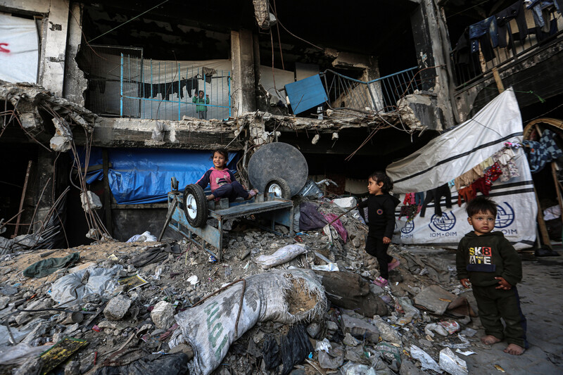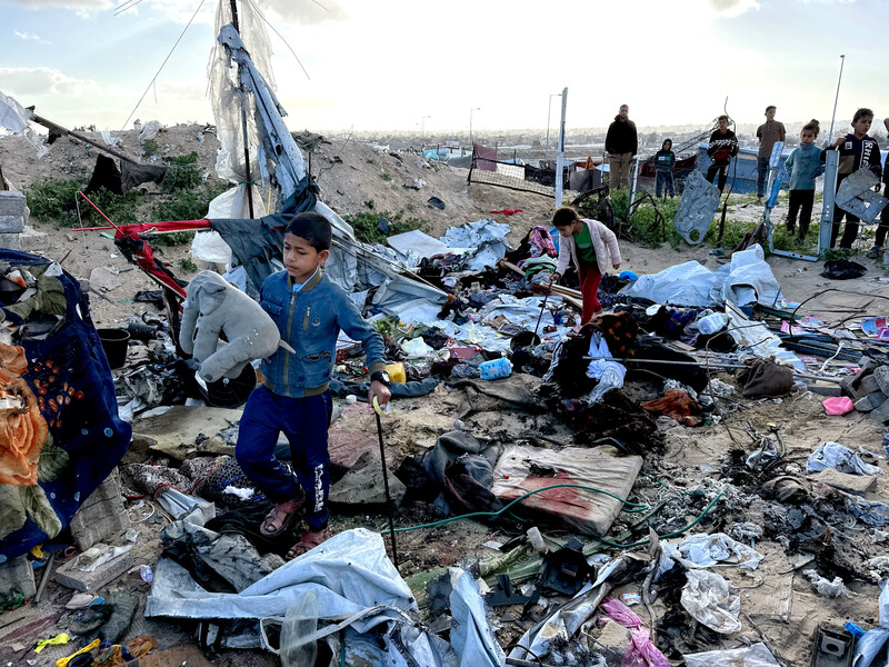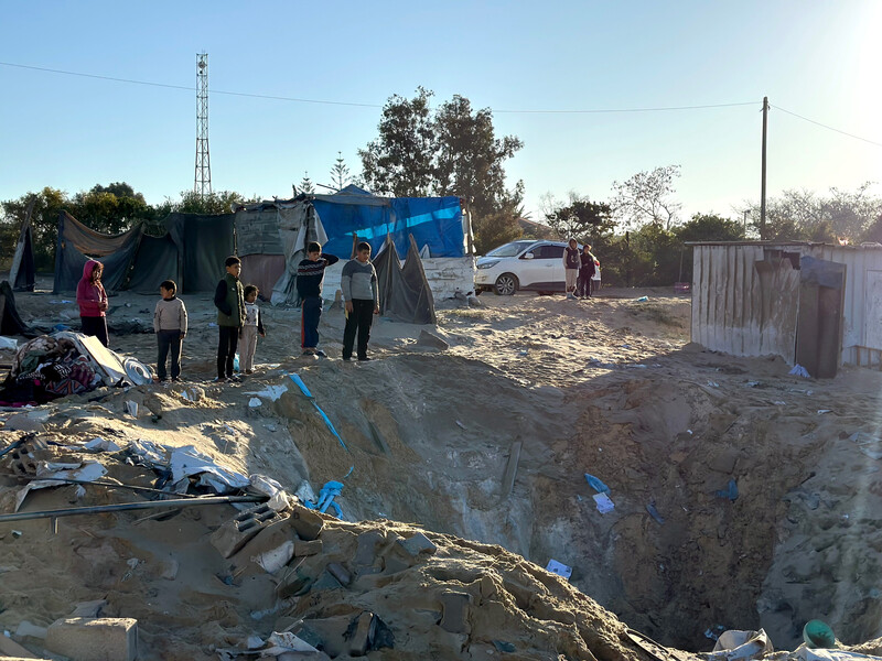 Children look at the site of an Israeli airstrike that targeted the tent of Hamas politiburo member Salah al-Bardawil and his family in Khan Younis, southern Gaza, 23 March. Several other figures in Hamas’ political wing have been targeted and killed along with members of their families since 18 March.