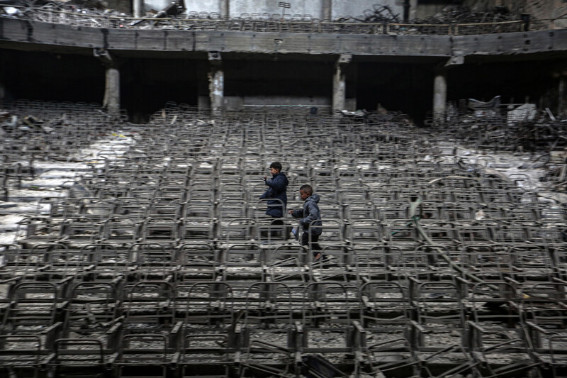 Children play in the burned-out auditorium of the Islamic University of Gaza in Gaza City on 21 March.