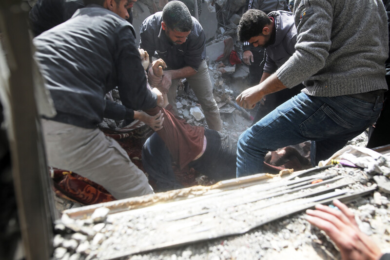 The bodies of members of the al-Mashharawi family are recovered from their home after it was targeted in an Israeli strike overnight in the al-Tuffah neighborhood, east of Gaza City, 22 March.