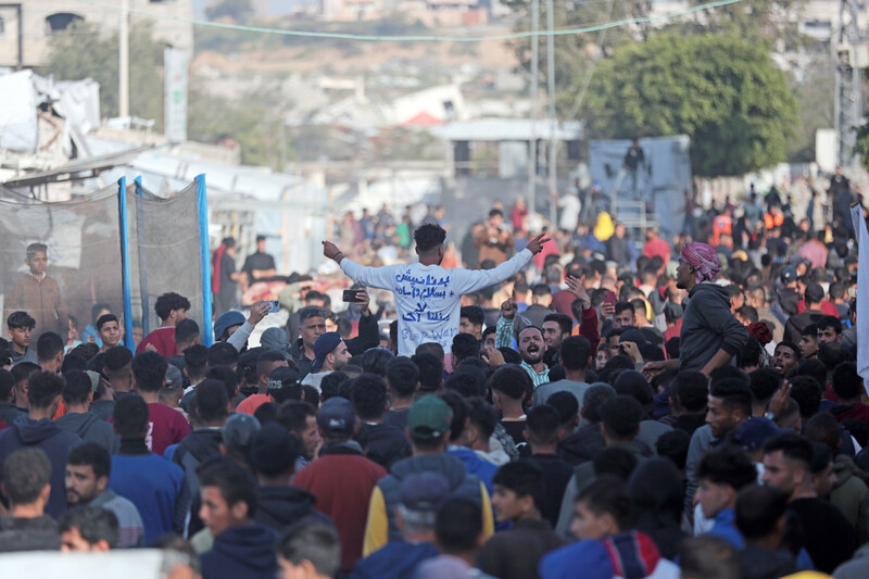 Relatives of nine Palestinians, including three journalists, killed in an Israeli attack in Beit Lahiya, mourn at the Indonesian Hospital on 15 March. According to sources, an Israeli drone hit a relief team distributing tents to residents whose homes had been destroyed.