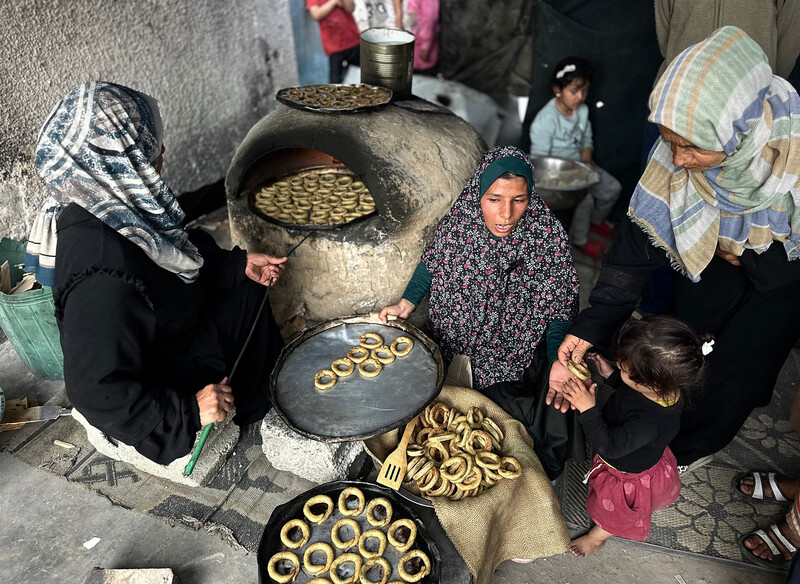 A Palestinian family prepares traditional cookies in preparation for Eid al-Fitr, the holiday marking the end of Ramadan, at an UNRWA school being used as a shelter for displaced people in Khan Younis, southern Gaza, 28 March.