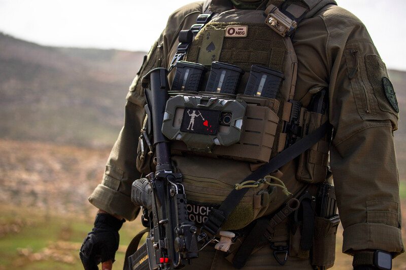 The uniform of an Israeli soldier as settlers invade Khirbet al-Tawil, a rural community in the West Bank, on 29 March. Israeli forces ordered Palestinians to stay away from the settlers trespassing on their land and a soldier aimed his gun at an ActiveStills photographer and two solidarity activists.