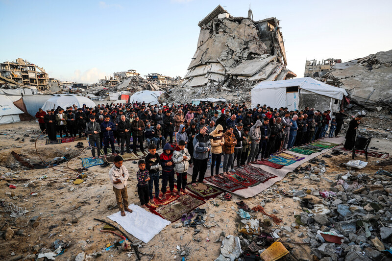 Worshippers pray during Eid al-Fitr in Jabaliya, northern Gaza, 30 March.