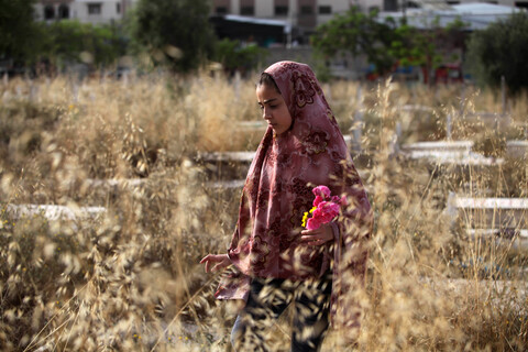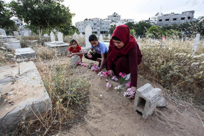 Palestinians visit the graves of their relatives at a cemetery during the first day of Eid al-Fitr, Gaza City, on 24 May.