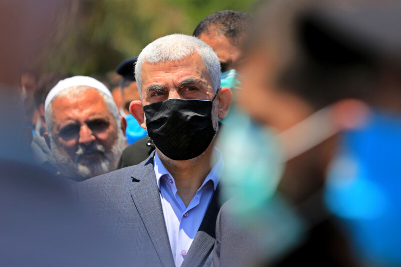 Yahya Sinwar, the head of Hamas in Gaza, attends the funeral of Hamas leader Ahmad Al-Kurd in Deir al-Balah, central Gaza Strip, on 10 May.