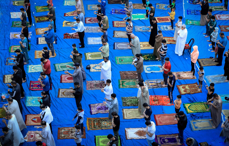 Palestinians perform Eid al-Fitr prayers marking the end of Ramadan in the northern Gaza Strip on 23 May.