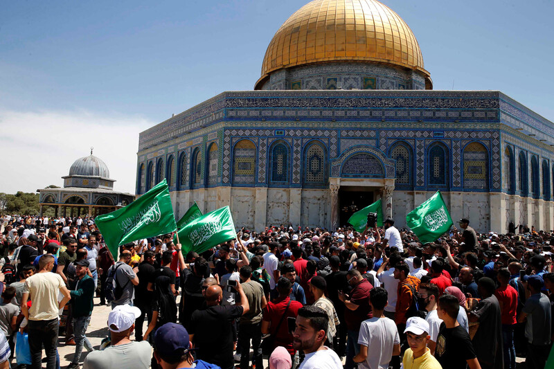 Hamas supporters mark al-Quds (Jerusalem) Day following the last Friday prayers of Ramadan outside the Dome of the Rock at the al-Aqsa mosque compound, Islam’s third holiest site, in Jerusalem’s Old City, 7 May.
