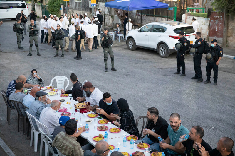 Palestinians facing forced eviction from their homes break their Ramadan fast as Israeli police guard Jewish settlers outside a home that they took over in the Jerusalem neighborhood of Sheikh Jarrah, 7 May.