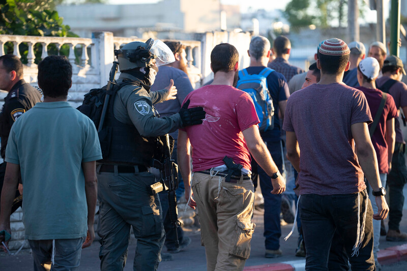 Israeli police accompany an armed settler during clashes in Lydd, a city in Israel, on 13 May. Palestinian residents of Lydd have been revolting against Israeli forces and armed settlers who arrived in the city to attack Palestinians and their property.