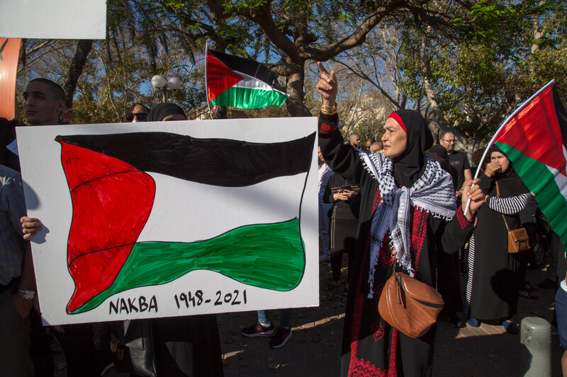 Palestinians and Israeli activists protest in Jaffa on 15 May after a 12-year-old Palestinian boy in the city was injured by a Molotov cocktail thrown into his home, allegedly by Jewish settlers, the previous day. Protesters also demonstrated against Israel’s attacks on Gaza and in observation of Nakba Day, the annual commemoration of the ethnic cleansing of Palestine before, during and after the declaration of Israel in May 1948