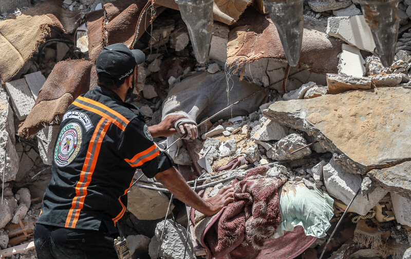 Palestinian rescue workers search for survivors and victims under the rubble of a residential building bombed by Israel on al-Wihda street in Gaza City’s affluent al-Rimal neighborhood, 16 May.