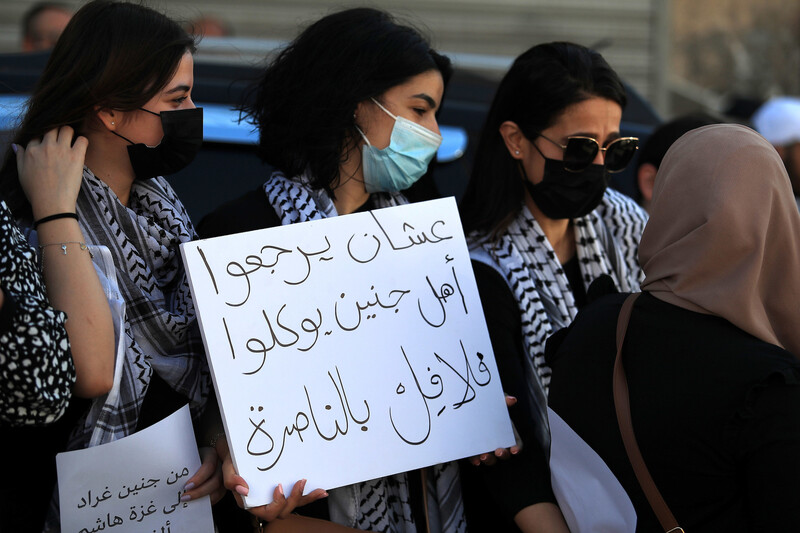 A woman holds a sign reading “So that the people of Jenin may return to eat falafel in Nazareth” during a protest in the northern West Bank city of Jenin on 18 May.