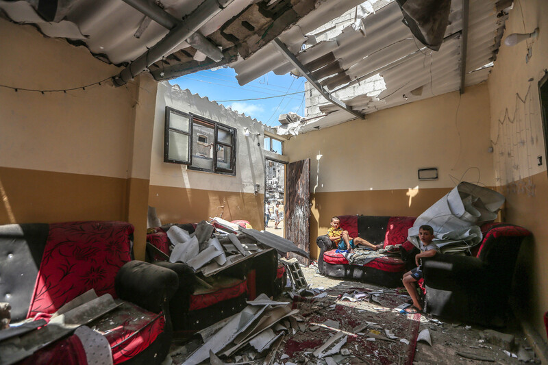 Palestinian children sit in a Gaza City home bombed by Israel, 21 May.