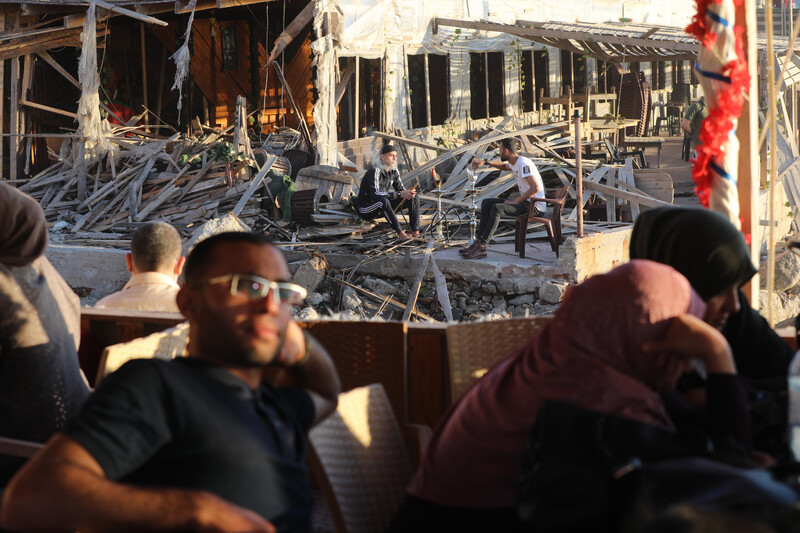 Palestinians relax at a cafe damaged by Israeli airstrikes on the beach in Gaza City, 23 May.