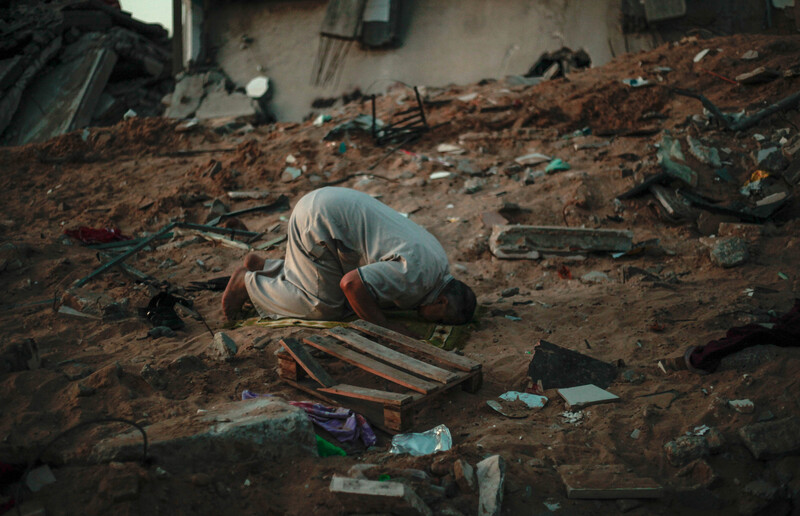 A Palestinian man prays on top of the ruins of a building destroyed in an Israeli airstrike, northern Gaza, 24 May.