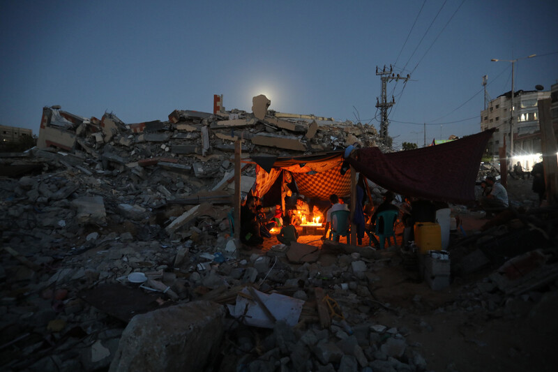 Palestinians sit in a tent on the ruins of a building destroyed in recent Israeli airstrikes, Beit Lahiya, northern Gaza Strip, on 25 May.