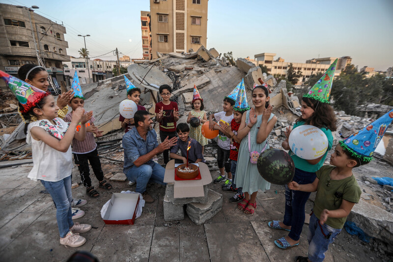 Mahmoud Sabih celebrates his 13th birthday with family and friends by the ruins of his Gaza City home that collapsed after an Israeli airstrike, 25 May.