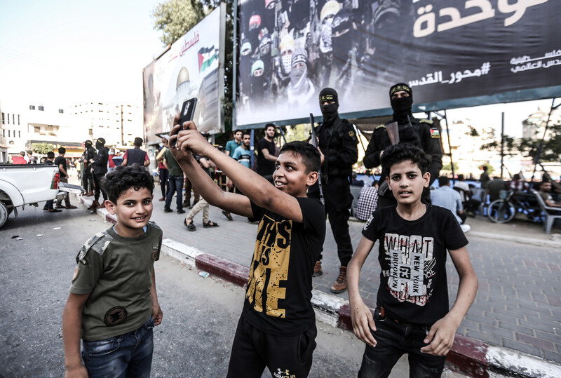 Children gather to watch the Quds Brigades, the armed wing of the Islamic Jihad resistance group, parade through the streets of Gaza City on 29 May.
