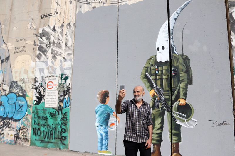 A man takes a selfie at a mural depicting a boy holding a fishbowl looking at a uniformed Israeli soldier wearing a white hood in the style of the Ku Klux Klan painted by Palestinian artist Taqi Spateen on Israel’s wall in the West Bank city of Bethlehem, 30 May.