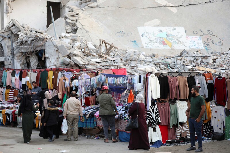 Palestinians shop in a street market near the rubble of al-Shurouq tower in Gaza City’s al-Rimal neighborhood which was targeted by Israeli airstrikes during May, 17 November. Al-Shurouq tower was one of nine destroyed by Israel during the 11-day escalation.
