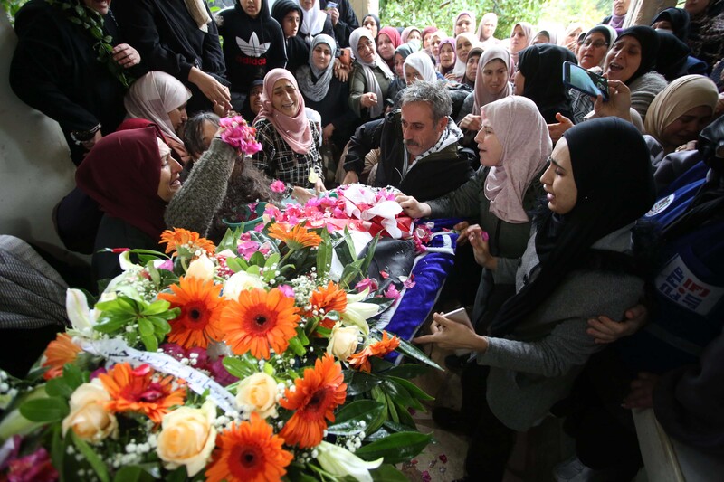 Palestinians mourn over the body of Isra Khazimiya during her funeral in Qabatiya village near the northern West Bank City of Jenin on 20 November. The woman was killed by Israeli forces in Jerusalem’s Old City on 30 September after she was stopped and allegedly pulled out a knife. Israel held her body for nearly three months.