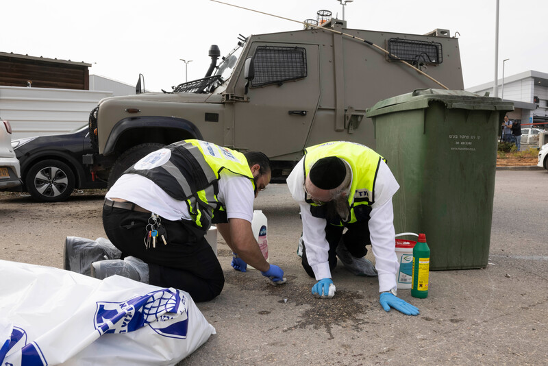 Zaka volunteers, an ultra-Orthodox Jewish emergency response team, work at the scene of an attack in and around the Ariel industrial zone in the West Bank on 15 November, during which a Palestinian killed three Israelis.
