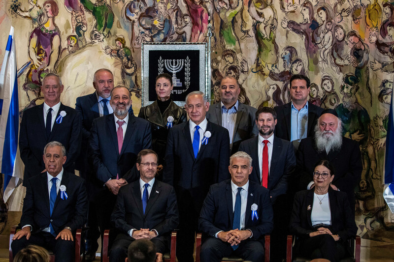 Benjamin Netanyahu, Israel’s incoming prime minister, poses with representatives of participating parties in parliament after the swearing-in of Israel’s 25th Knesset, 15 November.