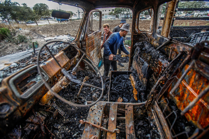 Palestinians inspect a truck loaded with citrus fruit that was set on fire by Jewish settlers during an attack near Shavei Shomron settlement, west of the West Bank city of Nablus, after a Palestinian killed three Israelis in and around the Ariel industrial zone, 16 November.