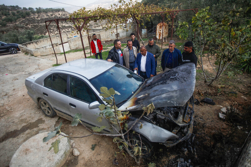 Palestinians inspect a burnt car after it was set on fire by settlers from Yitzhar in the village of Burin, near the West Bank city of Nablus, 24 November.