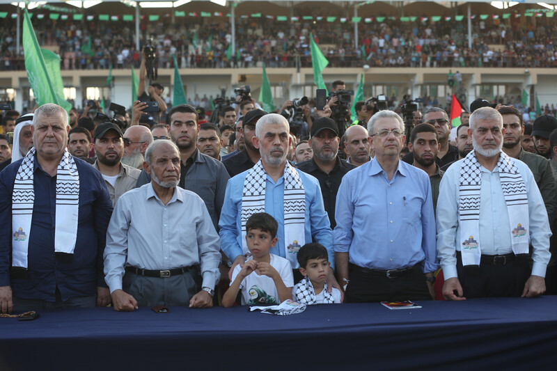Yahya Sinwar, the head of Hamas in Gaza, along with other Palestinian party leaders attends a festival in solidarity with al-Aqsa mosque at Palestine Stadium in Gaza City on 1 October.