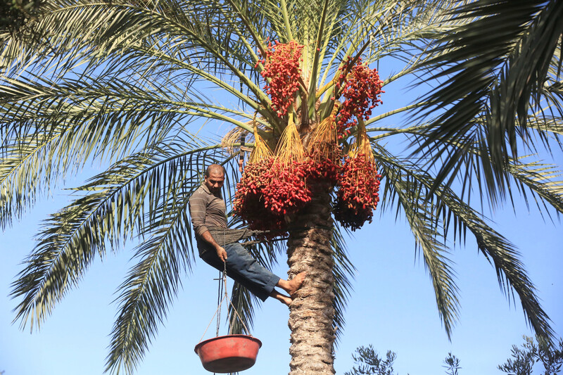 Palestinians harvest dates from a palm tree in Khan Younis, southern Gaza Strip, on 2 October.