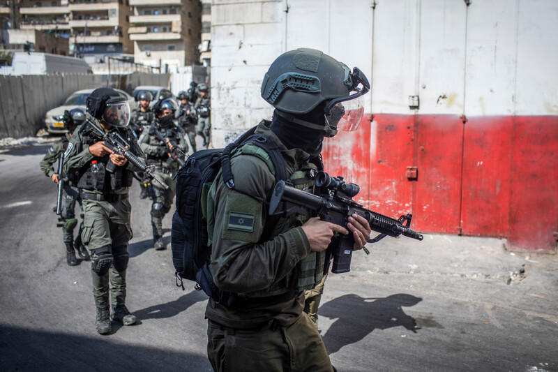 Israeli troops patrol Shuafat refugee camp on 10 October during a manhunt for a shooter who killed a soldier at a nearby checkpoint two days earlier.