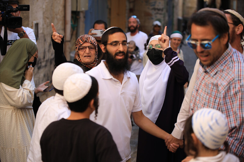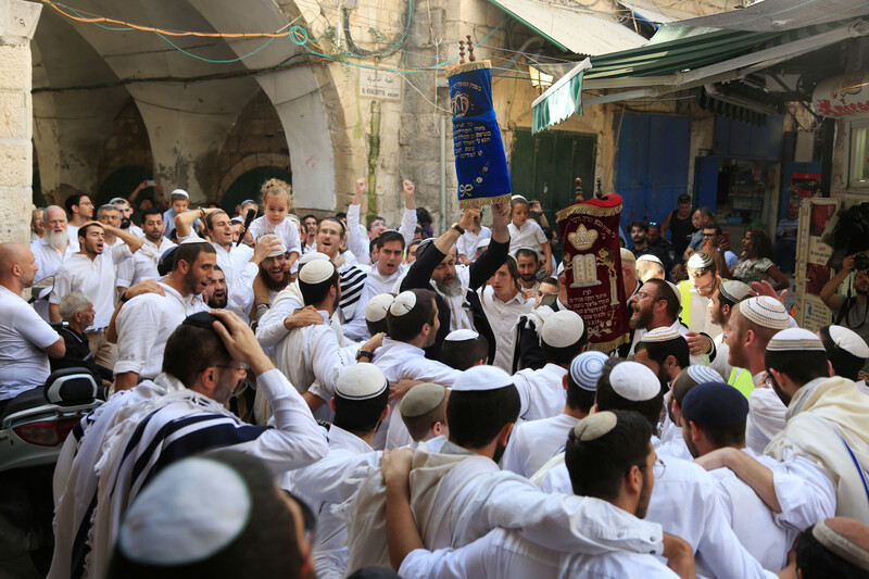 Palestinians protest outside Jerusalem’s al-Aqsa mosque compound as Jews gather to celebrate Sukkot near the holy site on 11 October.