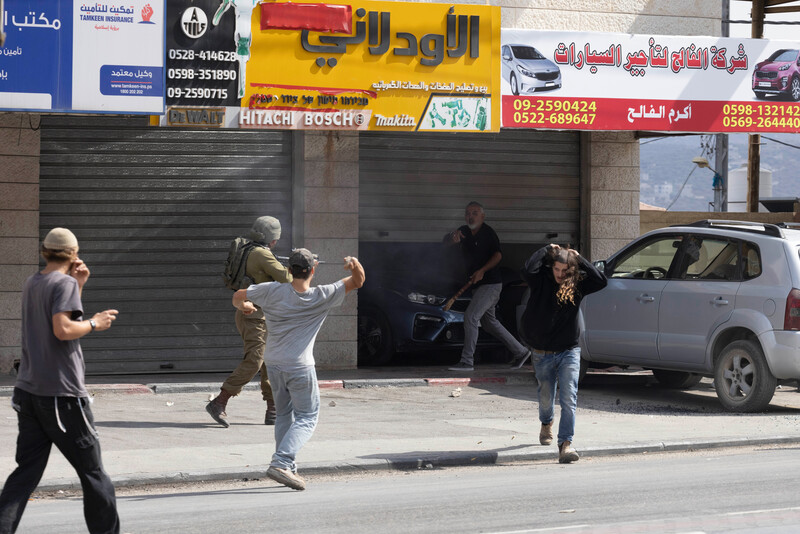 Jewish settlers, guarded by Israeli soldiers, attack Palestinian residents and their property in the West Bank town of Huwara, near Nablus, on 13 October.