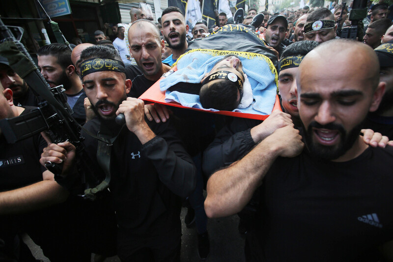 Palestinian mourners carry the body of Mateen Dabaya, killed during an Israeli raid, during his funeral in the flashpoint city of Jenin, in the northern West Bank, on 14 October.