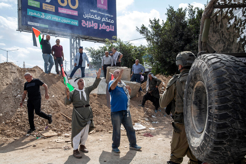 Palestinians protest the closure of the Nablus area and attempt to remove an earth mound newly imposed by Israeli forces in Deir Sharaf, west of the West Bank city of Nablus, 30 October. Since 11 October, Nablus has been under Israeli siege following the killing of an Israeli soldier by the Lions Den, a local armed resistance group.