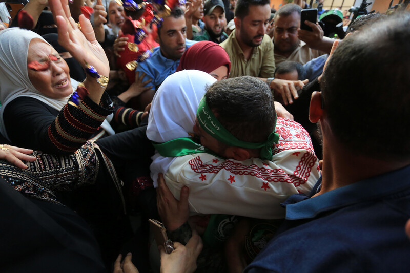 Palestinian freed prisoner Rami Abu Mustafa is welcomed by his relatives and friends upon his release from Israeli jails, in Khan Younis in the southern of Gaza strip on 20 October. The Israeli authorities released Abu Mustafa after spending 20 years inside its prisons.