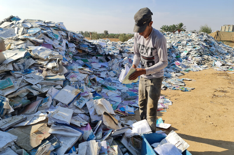 Palestinian workers repurpose discarded paper to produce egg cartons at a factory in Khan Younis, southern Gaza Strip, 22 October.