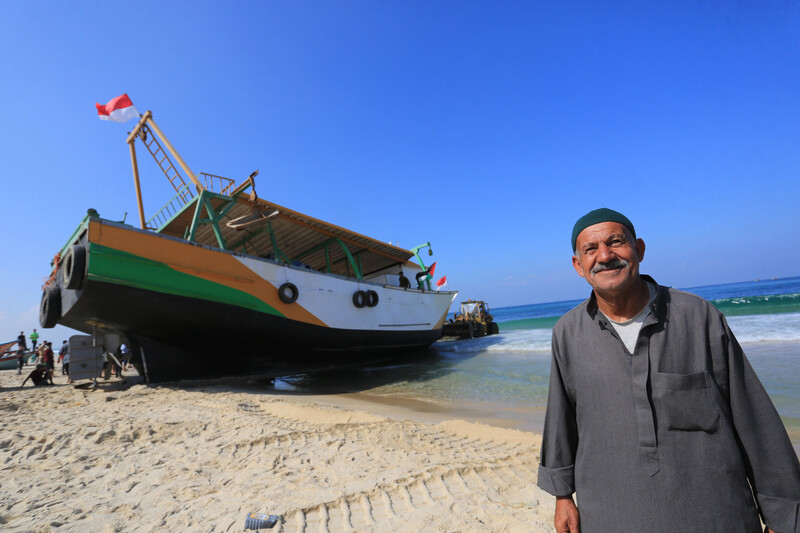 Palestinians gather during the launch of the largest fishing boat in the Gaza Strip in southern Khan Younis, 22 October. Palestinians made the largest fishing boat in the territory, measuring 21 meters long and 6 meters wide, with simple tools and equipment.