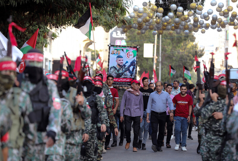 Fighters from the Quds Brigades, the military wing of the Islamic Jihad resistance movement, participate in a military parade on the 35th anniversary of the movement’s founding, in Khan Younis, southern Gaza Strip, on 4 October.