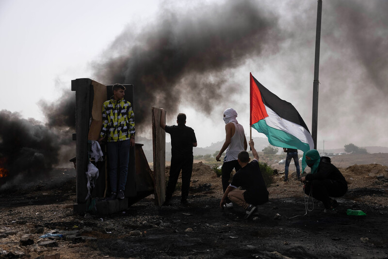 Palestinian youth confront occupation forces after the funeral of Qusai al-Tamimi, 19, killed the previous night by Israeli soldiers in Nabi Saleh, near the West Bank city of Ramallah, 25 October. Al-Tamimi was killed while taking part in an unplanned midnight protest in support of Nablus, where five Palestinians were killed in an Israeli military operation targeting the Lions Den militant group.
