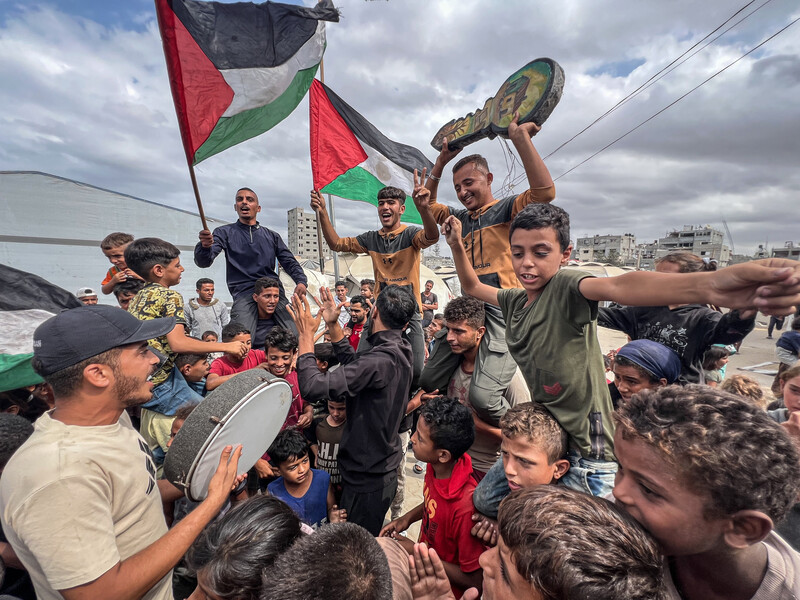 People celebrate in Nuseirat refugee camp, central Gaza, on 9 October following the announcement of a new ceasefire deal.
