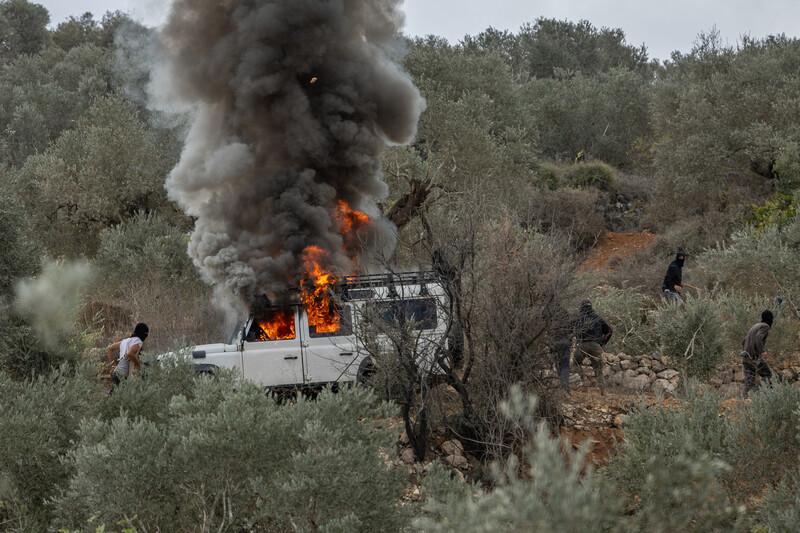 A vehicle is set on fire by settlers during an attack on the first day of the olive harvest in the West Bank village of Beita, 10 October. Dozens of settlers and soldiers used live ammunition, batons and stones during the attack, injuring several Palestinians and solidarity activists, including ActiveStills photographer Wahaj Bani Moufleh.