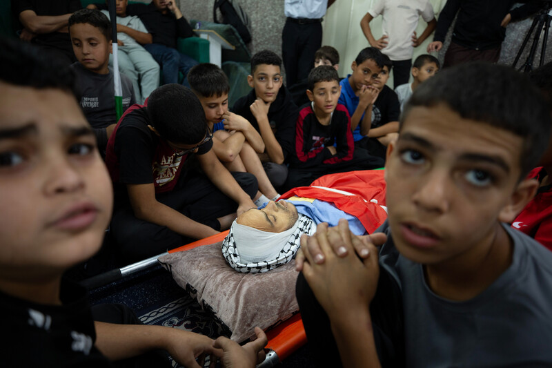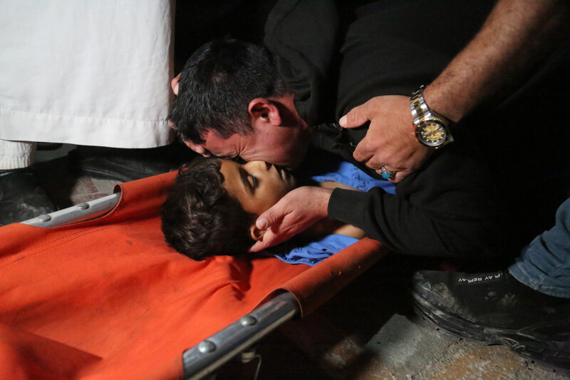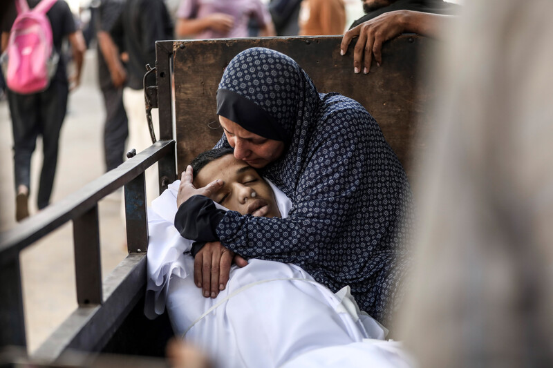 Sanaa al-Safadi mourns over the body of her 15-year-old son, Abdul Rahman, who was killed in overnight Israeli airstrikes, at Al-Shifa Hospital in Gaza City on 29 October.