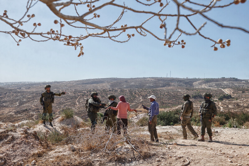 Palestinian olive farmers are forced off their land by Israeli forces in Kafr Malik, near the West Bank city of Ramallah, on 25 October. Soldiers gave the family, accompanied by international volunteers, only 20 minutes to leave.