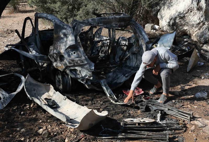 A man examines the wreckage of a car at the site where Israeli forces killed three Palestinians during a raid west of Jenin in the northern West Bank, 28 October.
