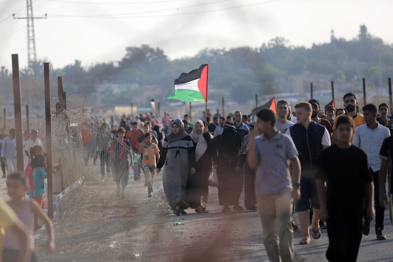 Palestinian women stand in front of the Gaza-Israel boundary fence during the 24th consecutive Friday of the Great March of Return protests on 7 September. Two teenage boys, both under the age of 18, were fatally wounded during the protests. Video shows that one of the teens, Ahmad Misbah Abu Tuyour, was shot while his hands were up in the air.
