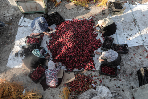 Palestinian farmers harvest dates from a palm tree in Deir al-Balah, central Gaza Strip, on 24 September.