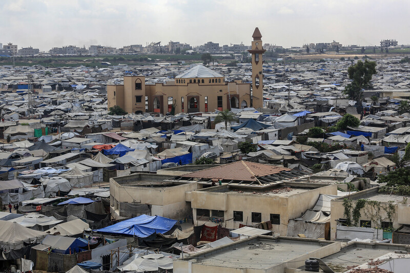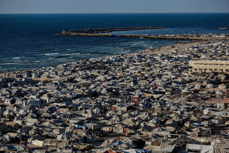 Tightly packed tents after the displacement of Palestinians from Gaza City to al-Mawasi, an area west of Khan Younis in the southern Gaza Strip, 2 September.