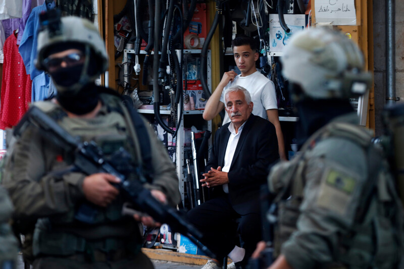 Israeli soldiers stand guard as settlers tour the Palestinian side of the Old City and market of Hebron in the occupied West Bank, 6 September.